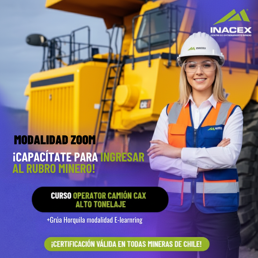 En Inacex nos especializamos en formar operadores de maquinaria pesada, especialmente camiones de extracción CAEX. Nuestro curso incluye teoría online en vivo, taller práctico con simulador de alto tonelaje y certificación avalada por el SENCE y el CCM.